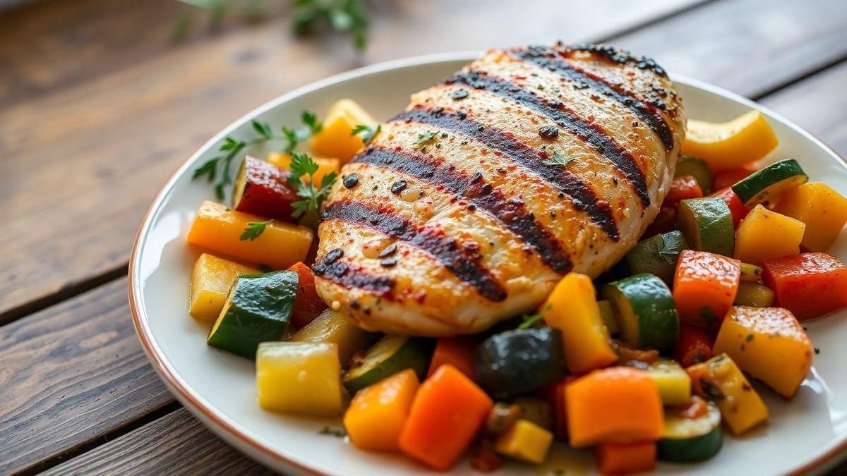 Os ingredientes deste prato foram escolhidos com carinho para criar uma mistura incrível. Imagine o frango marinado em temperos que adicionam muito sabor, enquanto legumes variados como pimentões e abobrinha se juntam a ele na grelha, liberando sucos e aromas que deixam tudo ainda mais gostoso. O alho adiciona um toque de intensidade, enquanto ervas frescas trazem uma frescura que equilibra o prato. Juntos, esses ingredientes criam uma refeição que é não só saborosa, mas também cheia de cores e texturas. Essa combinação faz do Frango Grelhado com Legumes uma opção irresistível para qualquer refeição!