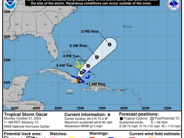 Oscar atingiu a costa na província oriental de Guantánamo, perto da cidade de Baracoa, na noite de domingo (20) com ventos de 75 mph (120 km/h). A tempestade também atingiu a costa no sábado em Great Inagua, nas Bahamas, onde os moradores foram evacuados depois que suas casas foram danificadas.